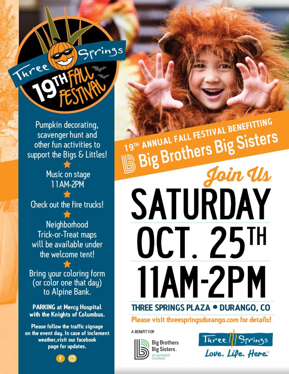Get your costumes ready and join us at Three Springs! Benefitting Big Brothers Big Sisters of SW Colorado, this 19th Annual Fall Festival takes place on Saturday, October 25th, 2025 for all your favorite Fall Fest activities: Neighborhood Trick or Treating (bring your own trick or treat bag!), Live Music, Pumpkin Decorating, Scavenger Hunt, Coloring Contest sponsored by Alpine Bank and other fun activities to support the Bigs & Littles! Parking at Mercy Hospital with the Knights of Columbus.